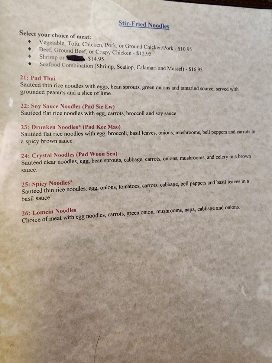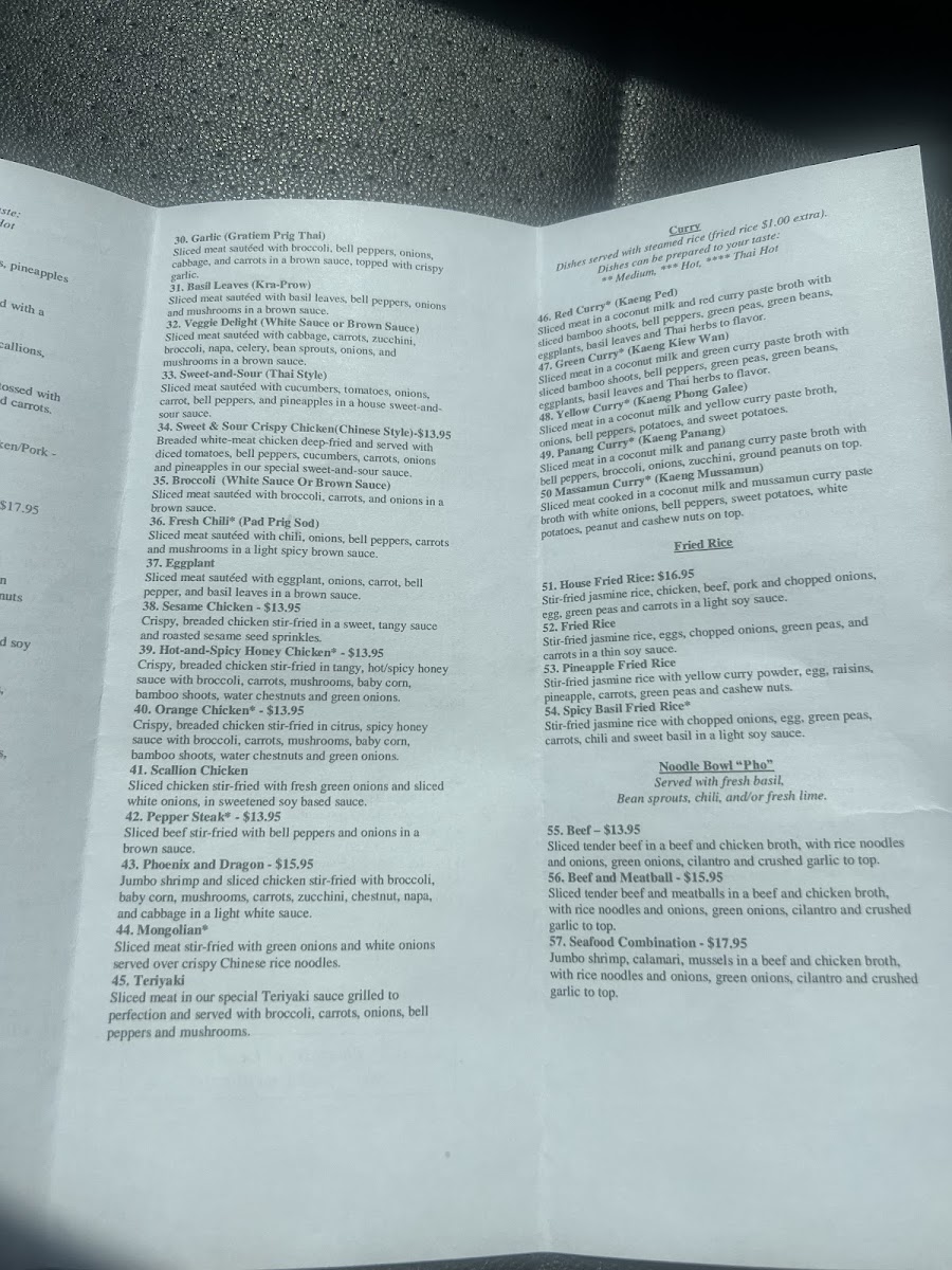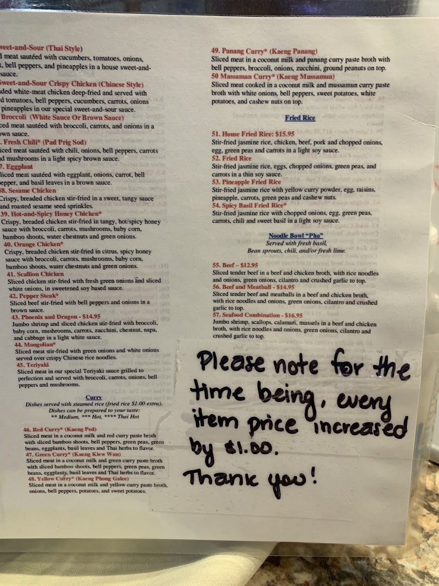 From crisp, freshly made spring rolls and flavorful soups like Tom Yum or Wonton to hearty noodle and rice dishes, the menu supports easy, enjoyable dining throughout the day. Highlights such as Orange Chicken, Red Curry with Bean Curd, and Basil Crispy Duck offer rich, satisfying flavors that pair well with the warm and inviting atmosphere of the restaurant. Vegetarian options like Garlic Tofu Stir Fry and Vegan Fried Rice ensure that plant-based diners can also find something enjoyable.